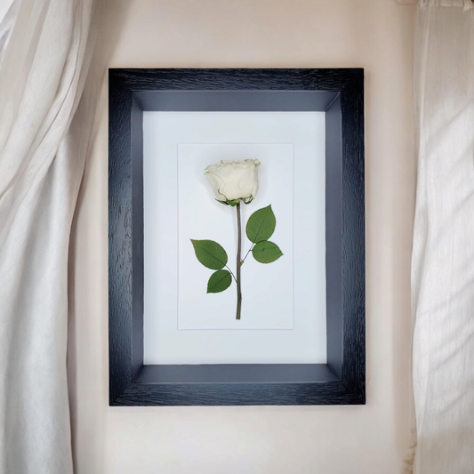 Our pressed flower art prices start at €250 (30cm x 40cm frame/ 1 rose) and go up to€800 (60cm x 100cm frame/ large spray). This includes preservation, artwork, sealing and framing in a solid wood frame, custom made in Ireland. There is a choice of artwork styles, sizes, canvas colours, frame colours and also the option to add wording is included in this cost.