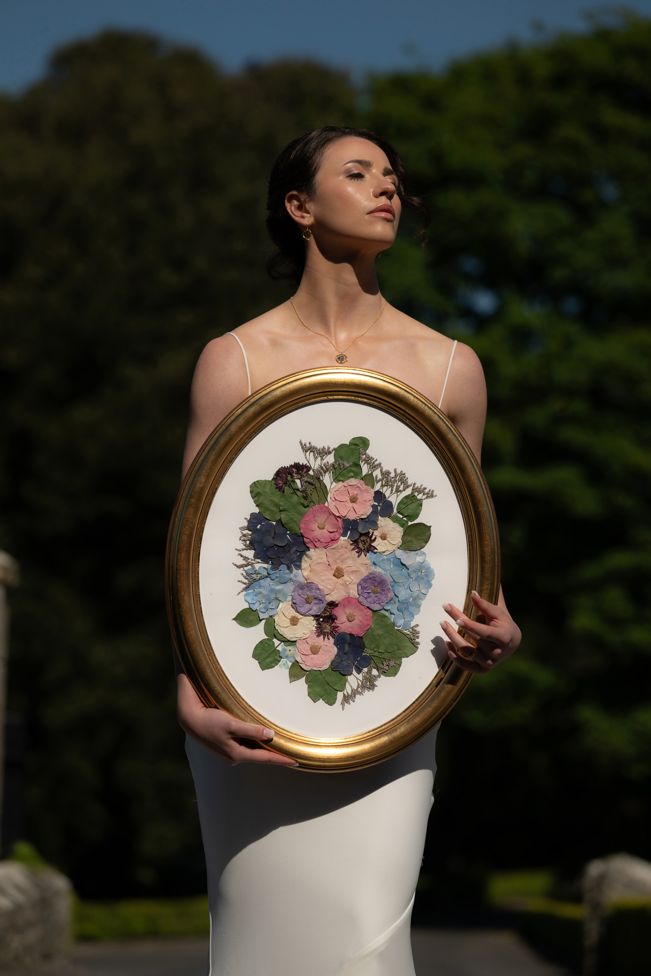 A one-of-a-kind bridal necklace designed just for you, made with a selection of pressed flowers from your bouquet. Professionally preserved and set by SIÓG Botanicals into a stunning pendant designed by Loinnir Jewellery.